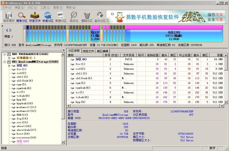 Windows系统上使用DiskGenius磁盘分区工具对手机磁盘里的分区进行删除,所删除的分区应该是管理、存储端口的,分区名为:sbl1。右击分区名删除重启,使用QFIL工具就可以找到9008端口号了,然后刷机即可。需要注意:删除分区后再次使用QPST工具进行刷机时会刷不进ProgramBoot Loaders,用QFIL刷之后即可恢复。